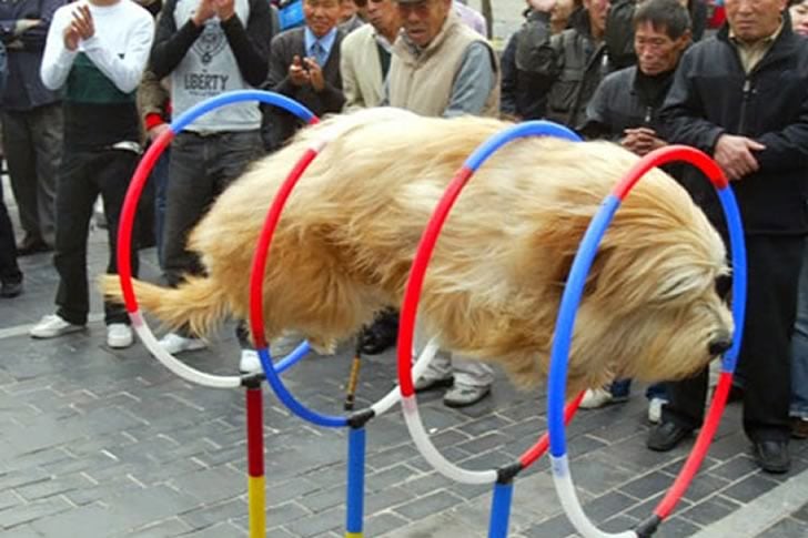 Questa incredibile immagine cattura un cane a mezz’aria mentre attraversa una serie di cerchi colorati, creando l’illusione di una sfocatura pelosa e volante. Il tempismo della foto è impeccabile: ogni cerchio incornicia il corpo del cane in un modo che comprime il movimento in un unico, surreale momento. Gli spettatori restano immobili per la meraviglia, i loro occhi fissi sull’artista che salta, mentre il cane sembra sospeso nel tempo, completamente senza peso.