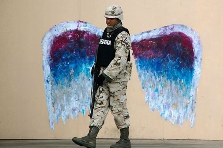 Mentre il soldato cammina oltre un muro semplice, emerge una visione straordinaria: un paio di ali colorate dipinte si allineano perfettamente dietro di lui. L’opera d’arte, una volta statica e decorativa, ora appare viva, dando l’illusione che le ali appartengano all’uomo in uniforme. Questo momento di allineamento accidentale trasforma la scena in qualcosa di poetico, suggerendo forza abbinata a grazia, dovere svolto con dignità, e forse anche una gentilezza nascosta sotto l’armatura della guerra.