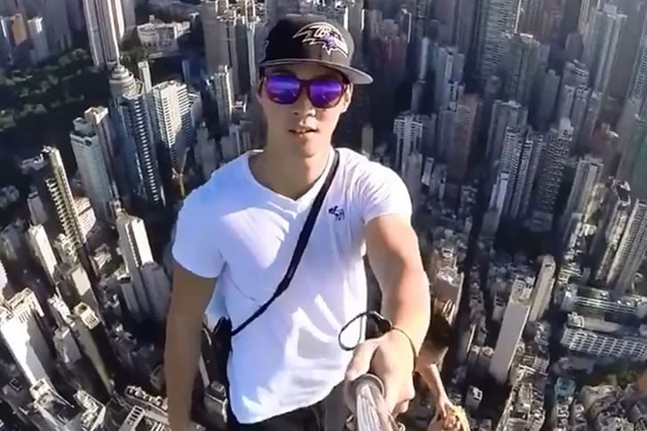 In equilibrio sul bordo di un grattacielo, questo temerario sfida la gravità e il buon senso. Con un selfie stick in mano e un’ampia metropoli che si estende sotto di lui, il giovane cattura un momento tanto mozzafiato quanto terrificante. Vestito in modo casual, sembra imperturbabile di fronte all’altezza vertiginosa, la sua espressione calma smentisce il rischio mortale. Ogni edificio visibile, ombra e tetto sottostante contribuisce all’effetto vertiginoso, rendendo questa non solo una foto, ma una performance ad alto rischio.