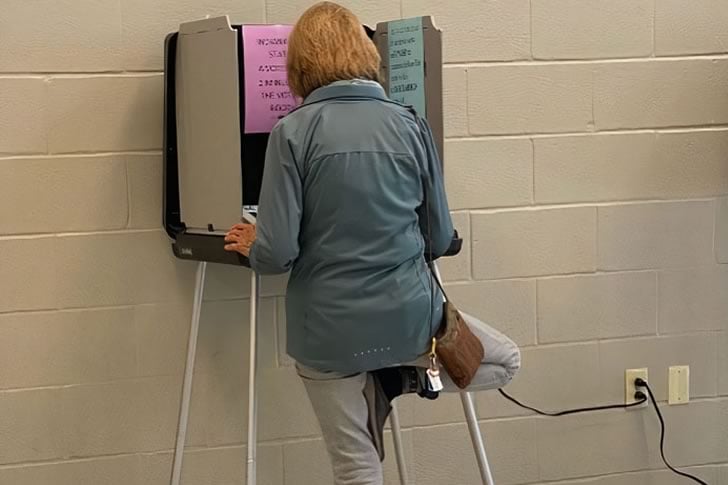A prima vista, sembra un momento ordinario di partecipazione civica. Una donna è in piedi in una cabina elettorale, apparentemente persa nella concentrazione. Ma uno sguardo più attento rivela un colpo di scena inaspettato: ha una gamba appoggiata casualmente dietro di sé sulla barra di supporto della cabina, in equilibrio come se fosse nel bel mezzo di una sessione di yoga. È una posa che unisce la presa di decisioni con inaspettate acrobazie.