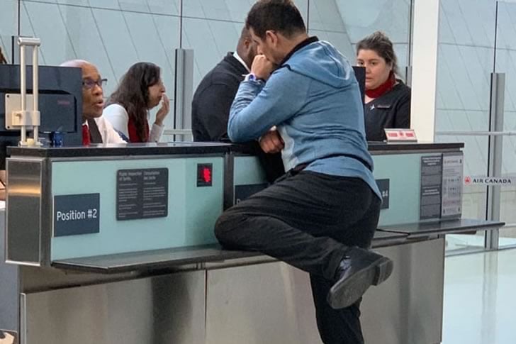 A prima vista, sembra un momento tipico a un banco del check-in dell’aeroporto — passeggeri in attesa, personale che assiste — ma un uomo riesce a ridefinire completamente il modo in cui le persone si sporgono per chiedere informazioni. Con un piede saldamente piantato e l’altra gamba goffamente issata sul bancone, assume una posa che sembra una versione moderna del “Pensatore” di Rodin, se quella scultura avesse perso la sua sedia. Il modo in cui il suo corpo si contorce nella conversazione aggiunge un ulteriore strato di drammaticità, come se il fatto di sporgersi gli desse letteralmente il sopravvento.