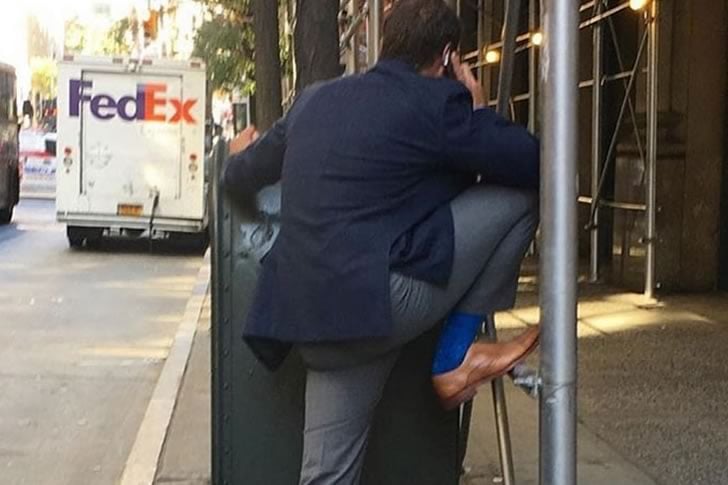 Su un marciapiede cittadino affollato, questo professionista impeccabile ha deciso che stare semplicemente in piedi non era sufficiente per la sua telefonata. Con una gamba appoggiata in modo incredibilmente alto contro una scatola di servizi e l’altro braccio appoggiato come un esperto scalatore, sembra assumere una posa a metà tra uno stretching yoga e una posa di potere. I calzini blu brillante e le scarpe lucidate non fanno che aumentare l’involontaria teatralità della sua performance in strada.