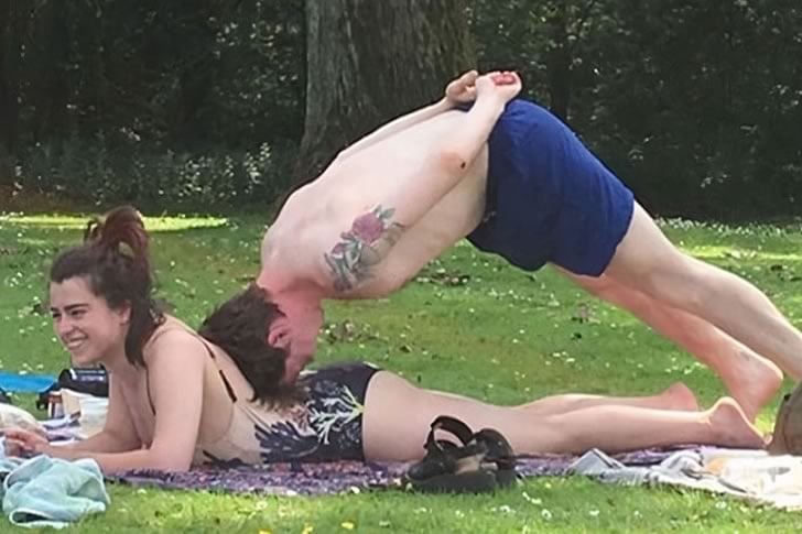 A prima vista, questa foto sembra una specie di illusione magica. Un uomo sembra galleggiare orizzontalmente a mezz’aria, colpendo di testa una donna che prende il sole sull’erba. Ma dopo una seconda occhiata, ti rendi conto che è tutto un trucco di prospettiva. L’uomo sta solo facendo una posizione di plank dietro la donna, la sua testa perfettamente allineata con la sua, creando un’esilarante illusione ottica che sembra un corpo lungo, stranamente piegato.