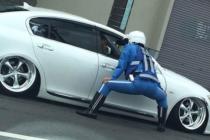 Preso nel bel mezzo di quello che sembra un normale controllo stradale, questo agente ha assunto una posizione che mescola intimidazione e atletismo. Con le ginocchia piegate e la schiena dritta, ha assunto uno squat a gambe larghe per parlare con il conducente all’altezza degli occhi. La posizione è stranamente teatrale, come se stesse per scatenarsi in una routine di ballo o sfidare l’auto a duello. L’intensità della sua postura è eguagliata solo dalla precisione aerodinamica dell’auto di fronte a lui.