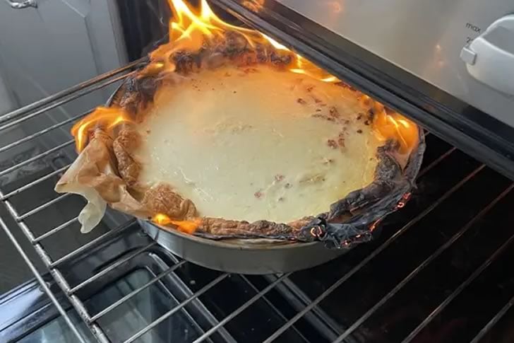 Questo disastro infuocato in cucina mostra esattamente cosa succede quando le buone intenzioni incontrano una pessima esecuzione. Il fornaio probabilmente voleva solo fare una deliziosa quiche o torta, ma ha dimenticato un dettaglio chiave: la carta da forno. È straripante e chiaramente troppo vicina agli elementi riscaldanti, trasformando un semplice pasto in un vero e proprio rischio di incendio. Un secondo stai preparando la cena, e il successivo, stai chiamando un estintore.