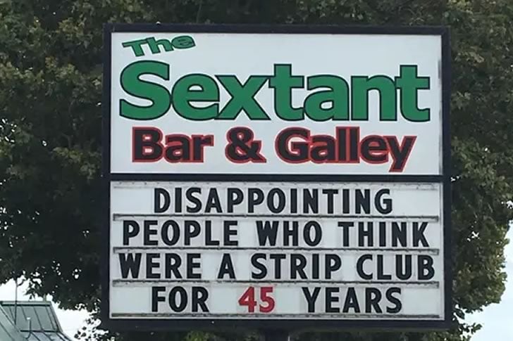 Per oltre quattro decenni, The Sextant Bar & Galley ha involontariamente ingannato i curiosi e gli speranzosi con un nome che suona molto più audace di quanto non sia. Mentre “Sestante” è uno strumento nautico, suggerisce chiaramente qualcosa di molto meno innocente a molti visitatori per la prima volta. Lo staff ha persino abbracciato la confusione con un cartello sfacciato che ammette di aver “deluso le persone che pensano che siamo uno strip club da 45 anni.”