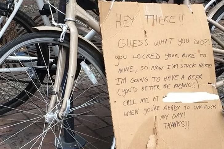 Immagina di uscire a prendere la tua bici, solo per scoprire che è stata presa in ostaggio dal lucchetto incurante di qualcun altro. Questo è esattamente quello che è successo qui. Uno sconosciuto ha inavvertitamente legato la sua bici a quella di un altro ciclista, incatenando di fatto entrambe in un involontario atto di imprigionamento urbano. La reazione del ciclista bloccato? Un grande, sarcastico biglietto di cartone, che sfoga umoristicamente la frustrazione e chiede una birra come compenso per l’inconveniente.