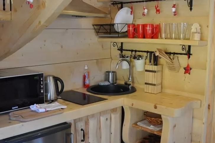 La cucina a pianta aperta è progettata per essere pratica e funzionale, sfruttando al meglio il suo spazio compatto. Dotata di frigorifero, microonde, bollitore, piano cottura a induzione e lavello, tutto ciò di cui hai bisogno è a portata di mano. Nonostante le dimensioni, non risulta angusta grazie a scelte di layout intelligenti.