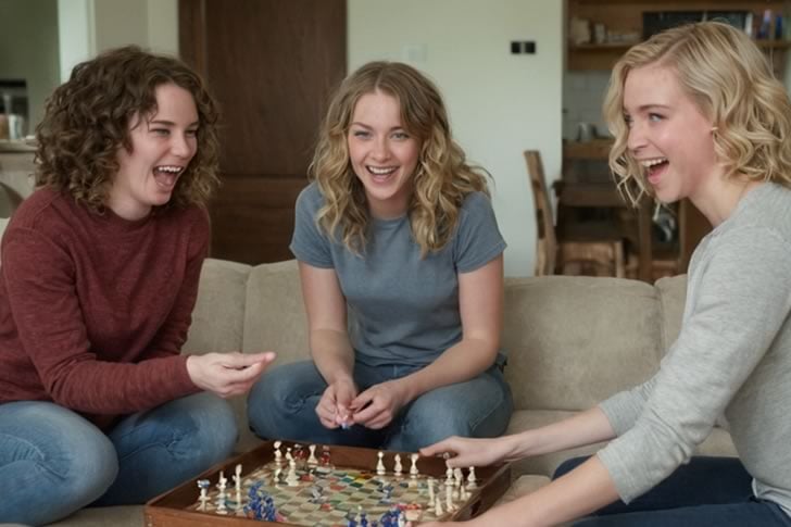 Jamie et Emily décidèrent de passer la journée à faire les choses qu’elles aimaient faire ensemble. Dépoussiérant de vieux jeux de société, elles s’installèrent dans le salon, Sarah les rejoignant avec une curiosité espiègle. Pendant qu’elles jouaient, des rires familiers emplirent l’air, adoucissant les aspérités du temps perdu.