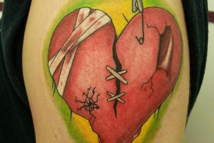Un tatuaje clásico de corazón roto suele ser una elección emocional segura. Pero en este caso, el corazón es tan irregular y desigual que parece que lo dibujó un niño pequeño durante una rabieta. Incluso hay una tirita dibujada sobre la grieta, lo que de alguna manera lo hace más triste y gracioso al mismo tiempo.