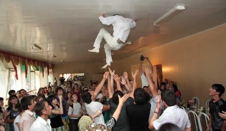 Non sappiamo come quest’uomo sia finito a testa in giù attraverso il soffitto, ma lo sguardo preoccupato sui volti di tutti suggerisce che non fosse pianificato. Se quello è lo sposo, potrebbe aver appena trasformato il suo matrimonio in un viaggio al pronto soccorso.