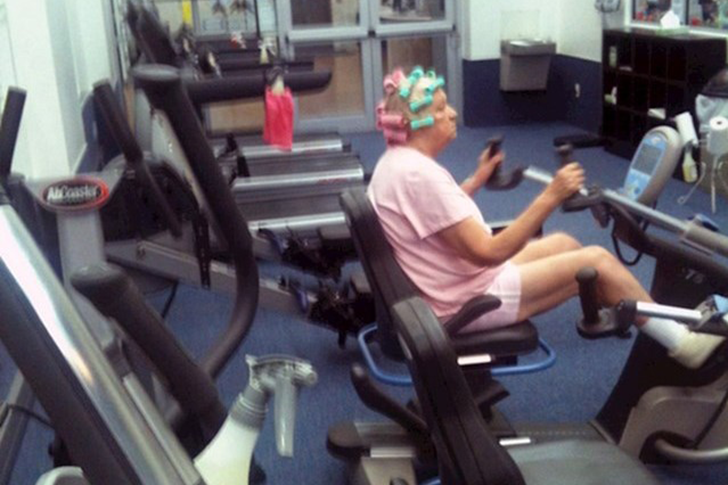 Gestione del tempo a livelli da maestra! Questa signora piena di energia dimostra che beauty routine e allenamento possono combinarsi alla perfezione. Mentre altre si fanno asciugare i bigodini sul divano, lei sfrutta il tempo in modo efficace – con allenamento con i pesi e styling dei capelli inclusi!