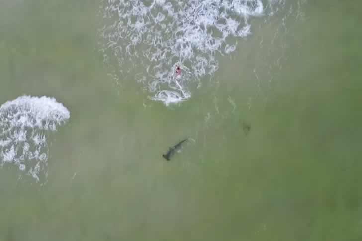 Questa foto, scattata da un drone, è stata ripresa su una spiaggia di Panama City, in Florida, e mostra una donna ignara della pericolosa vicinanza di uno squalo martello. Non è difficile immaginare il terrore che questa donna deve aver provato vedendo lo squalo avvicinarsi sempre di più. Ed è altrettanto facile immaginare la preoccupazione dei passanti circostanti per questa situazione.