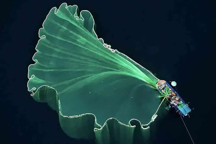 Vista da un drone, la rete da pesca è disposta come un’aurora boreale, quasi fosse una magnifica opera d’arte disegnata dalla natura. Inoltre, si possono vedere chiaramente anche le forme dei fili che legano la rete. Se avessimo saputo che la pesca potesse essere così divertente e bella, forse avremmo scelto di fare i pescatori. Per quanto ci riguarda, faremmo sicuramente quella scelta.