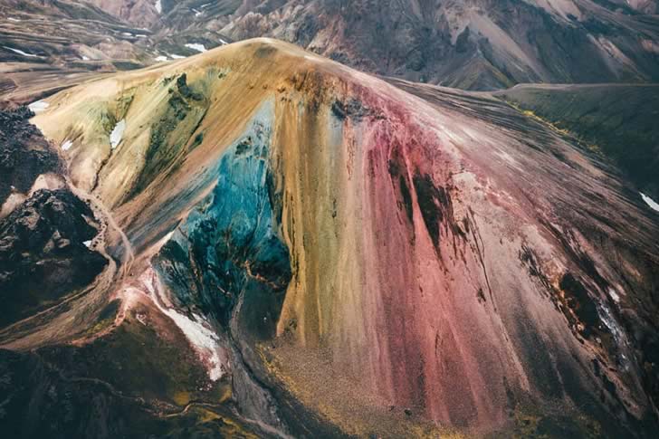 Di solito, quando un vulcano erutta, gas e lava fusa si mescolano e si depositano sui fianchi della montagna. Nella foto qui sotto, questo fenomeno è rappresentato con colori vivaci. Qual è la causa di questi colori? Secondo i geologi, questo vulcano islandese contiene zolfo, che crea queste magnifiche sfumature. Inoltre, si aggiungono vari colori naturali come il verde del muschio, il blu della lava e il rosso dovuto al ferro presente nel terreno.