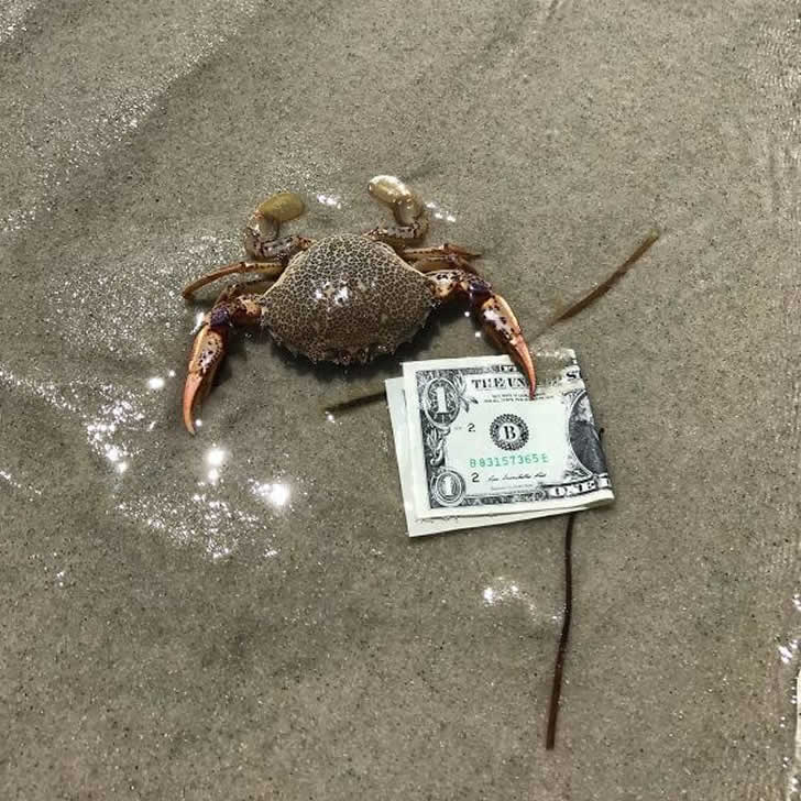 C’è un granchio che tiene in mano una mazzetta di soldi – o almeno sembra – e tutta la scena sembra un losco affare sulla spiaggia. Magari sta corrompendo un bagnino, o forse sta cercando di comprarsi la strada per tornare in mare.