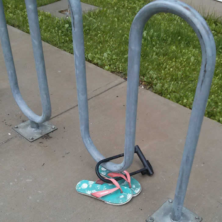 Alcune spiagge sono famigerate per i furti di scarpe, ma questa persona non voleva correre rischi. Ha chiuso a chiave le sue infradito economiche con un lucchetto vero e proprio.