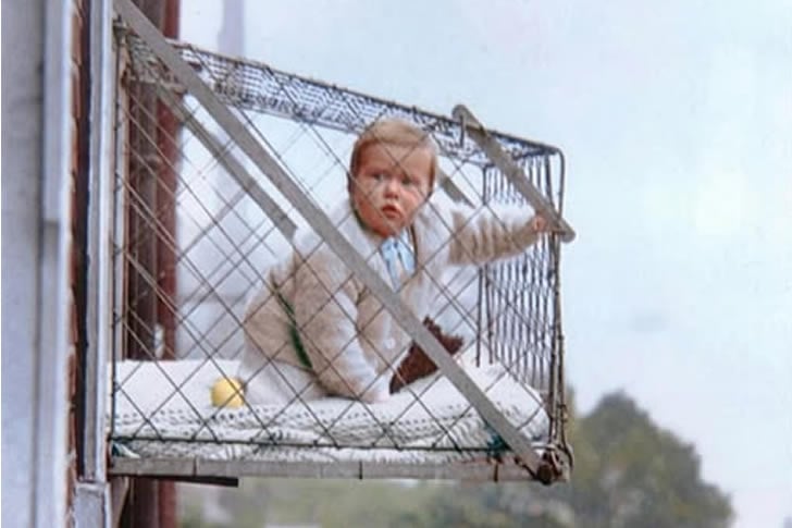 Nella Londra degli anni ’30, i genitori legavano i loro bambini a culle a rete e li appendevano fuori dalle finestre degli appartamenti, a volte anche a dieci piani d’altezza. L’idea? Dare ai bambini “aria fresca” senza lasciare l’appartamento. Non è uno scherzo: questo era commercializzato come un’“innovazione per la salute”.