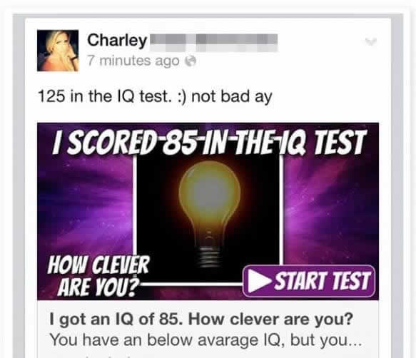 Una ragazza ha fatto un test del QI e ha condiviso con orgoglio i suoi “alti” risultati con tutta la sua famiglia. Sfortunatamente, non si è resa conto che il post automatico includeva una piccola clausola di esclusione di responsabilità dal sito che l’ha efficacemente “smascherata” riguardo alla vera natura del suo punteggio.