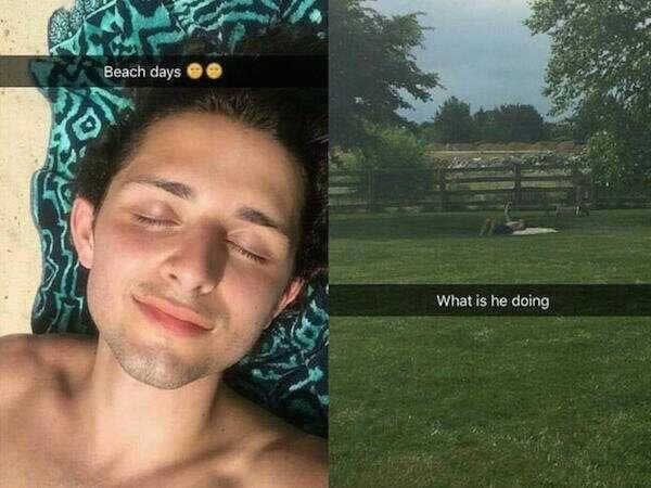 Sfortunatamente per lui, un passante lo ha colto in flagrante mentre si scattava un selfie da un’angolazione bizzarra. Hanno scattato una foto “dietro le quinte” di lui, rivelando che in realtà stava cercando di far sembrare i suoi dintorni mondani una rilassante giornata in spiaggia.
