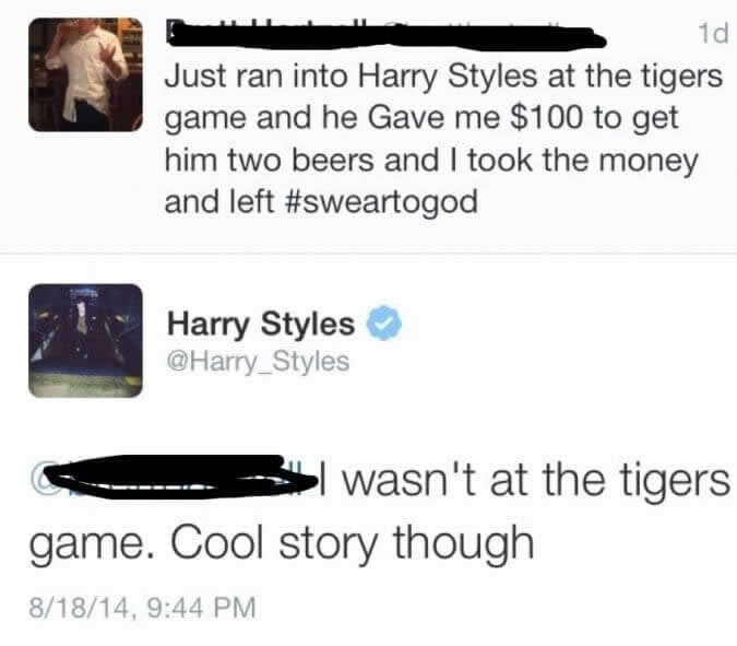 Fabbricare storie su incontri con celebrità è diventato uno strano passatempo online, e questo utente pensava di potersi unire alla schiera dei troll di successo. Ha condiviso una storia incredibile sull’incontro con Harry Styles a una partita di baseball e sul fatto di aver ricevuto una banconota da 100 dollari, ma è stato smentito dalla fonte stessa.