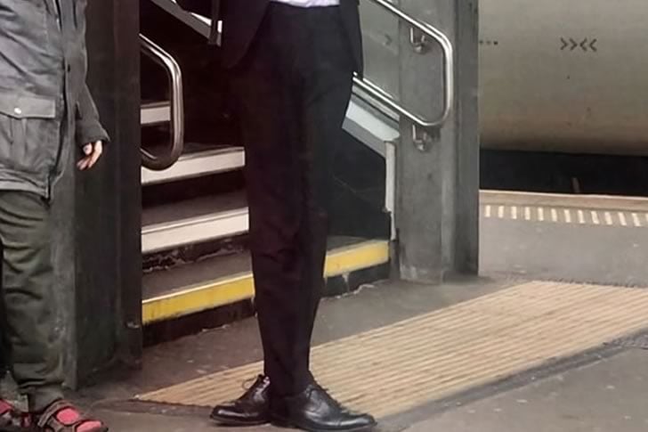 一見すると、この写真を見たとき、思わず二度見してしまうかもしれません。ビジネススーツを着た男性は、異常に背が高く、まるで漫画のようですが、何が起こっているのかに気づくと、その理由がわかります。彼の後ろにいる人物との完璧なタイミングでの位置合わせが、彼が信じられないほど短い足でサンダルを履いているような錯覚を生み出しています。それは、通常の駅のプラットフォームが視覚的なコメディーの舞台に変わる、見逃しがちな一瞬なのです。
