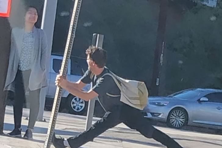 プロのポールダンサーのように街路標識を掴んでスプリットを決めているこの男性は、まるでシルク・ドゥ・ソレイユのオーディションのリハーサルをしているかのようです。ストレッチをしているのか、つまづいたのか、それとも劇的なポーズをとっているのか、この写真を見たら二度見せずにはいられません。彼の集中した表情と、予想外のスプリットの完璧なフォームが、このシーン全体の面白さをさらに引き立てています。