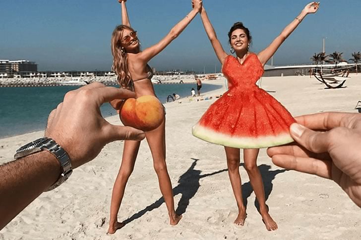 2人の女性がビーチでドラマチックなポーズを決め、前景にある巨大な手が彼女たちを「着飾らせて」います。1人は桃のビキニボトム、もう1人はスイカのフルガウンです。この目の錯覚はあまりにも完璧で、まるで母なる自然がスーパーマーケットの農産物でスタイリストを演じることを決めたかのようです。