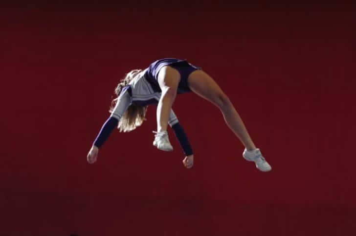 まるで急降下しているように見えますが、これは実は計画されたチアリーディングのスタントです。この選手はスーパーヒーローのように腕と脚を伸ばして飛びます。ご心配なく。この瞬間は劇的ですが、安全です。