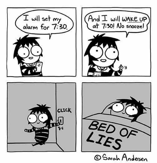40以上のミーム:どこでも見かけるあの画像、ついに解説 #17 Advertisements この漫画は、共感できる「ベッド vs. 目覚まし」ミームです。最初の2コマでは、登場人物が自信満々に7時半に目覚ましをセットし、スヌーズなしで時間通りに起きると約束しています。ものすごく意気込んでいますね。3コマ目では就寝し、最後のコマでは完全にベッドに寝そべっています。ベッドには面白くも「嘘つきベッド」というラベルが貼られています。 Advertisements 前次のページ このジョークは単純です。どんなに早起きしようと決意しても、結局ベッドがいつも勝ってしまうということです。これは、誰もが経験する寝坊や目覚ましを無視することとの格闘を面白おかしく誇張したものです。 Advertisements PREV NEXT PAGE