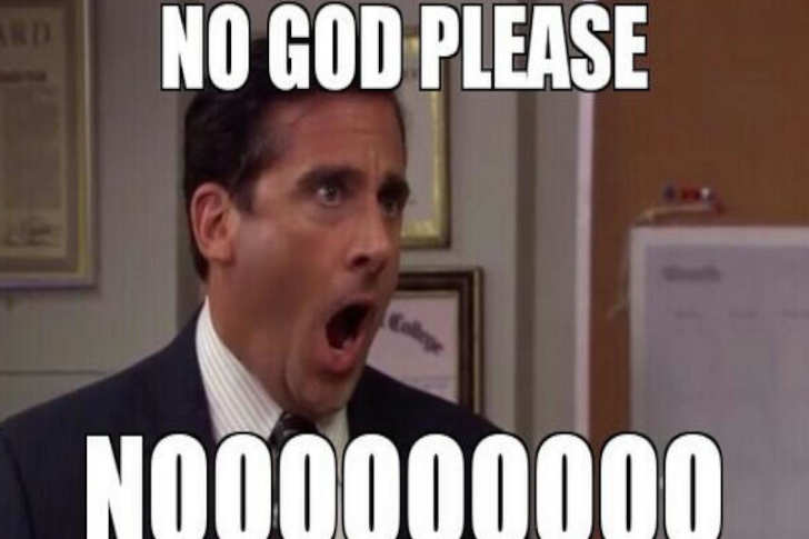 このミームは、ドラマ『The Office (US)』でマイケル・スコットが純粋なパニック状態の中で「NO GOD PLEASE NOOOOOO(神様、やめてくれぇぇぇぇぇ!)」と叫ぶシーンから来ています。お気に入りの番組が打ち切りになったり、ノートパソコンにコーヒーをこぼしたりした時のような、壊滅的な出来事に対する完璧なリアクションです。このシーンの度を超えたドラマ性が、深い絶望を表現するのに共感できて、しかも爆笑を誘う方法となっています。