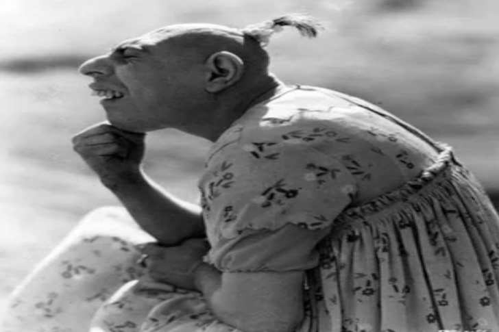 これは、20世紀初頭の有名な見世物芸人であるシュリッツィーの歴史的な写真です。彼は映画『フリークス』への出演で知られています。小頭症であったため、彼に独特の容姿を与え、ポップカルチャーにおいて愛される存在となりました。この画像は、彼の陽気で子供のような雰囲気を捉えており、しばしば芸の一部としてフリルのドレスをまとっていました。