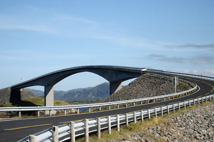 ノルウェーにあるStorseisundet橋は、ノルウェー本土とアヴェロイ島を結ぶ橋。国が設置した橋であり、いわば国道です。道沿いから眺めると、キレイな放物線を描いて続いており、橋自体も緩やかなアーチが美しく見えます。「やっほー」と叫びたくなる清々しさですね。しかし、この橋を建設するのは簡単なことではありませんでした。