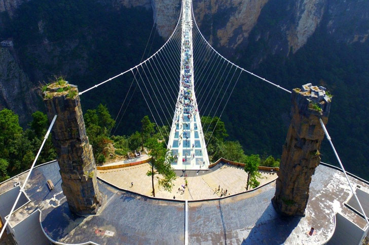 「張家界ガラス橋(Zhangjiajie Glass Bridge)」は、中国・湖南省の張家界にあるスカイウォーク型の歩道橋です。2016年8月にオープンしたこの橋は、当時「世界で最も長く、最も高いガラス橋」として注目を集めました。全長は約430メートル(1,410フィート)、幅は約6メートル(20フィート)、そして地上からの高さは約300メートル(980フィート)におよび、張家界国家森林公園にある2つの山の間にかかる峡谷を横断しています。最大で一度に約800人の観光客が橋の上に乗れるように設計されており、スリルと絶景を楽しめる人気スポットです。