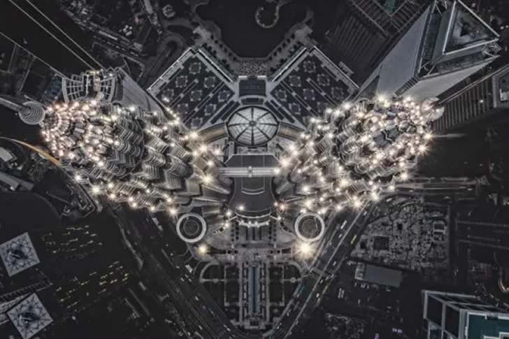その一例が写真家Tomasz Kowalski氏です。彼はドローンを使用して、空からまるでエイリアンの構造物のように見える建物を撮影しました。実はこの建物、マレーシアにある世界有数の高さを誇る「ペトロナス・タワーズ」だったのです。この写真は、万華鏡を通して見たような幻想的な雰囲気を醸し出しています。