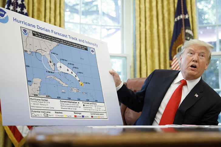 2019년 ‘샤피게이트’ 사건에서 트럼프는 국립 허리케인 센터의 도리안 지도에 샤피 펜으로 선을 추가하여 폭풍의 경로가 앨라배마로 확장되도록 표시했습니다. 이는 그가 트윗으로 앨라배마가 위협받고 있다고 주장한 이후였습니다. 이 행동은 공식 예보와 모순되어 광범위한 조롱을 받았습니다.