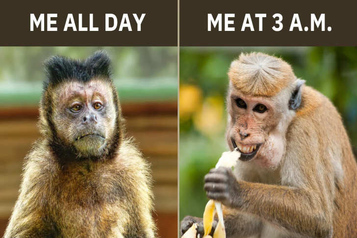 이 분할 밈은 낮 동안 피곤하고 의욕 없는 상태로 지내다가 새벽 3시만 되면 게걸스러운 괴물로 변하는 보편적인 경험을 완벽하게 포착합니다. 왼쪽에는 지루하고 지쳐 보이는 원숭이가, 오른쪽에는 바나나를 입에 밀어 넣는 원숭이가 있습니다. 시계가 자정을 넘어가면 “배 안 고파”에서 “냉장고에 있는 거 다 먹어야 해”로 바뀌는 우리의 모습과 똑같죠.