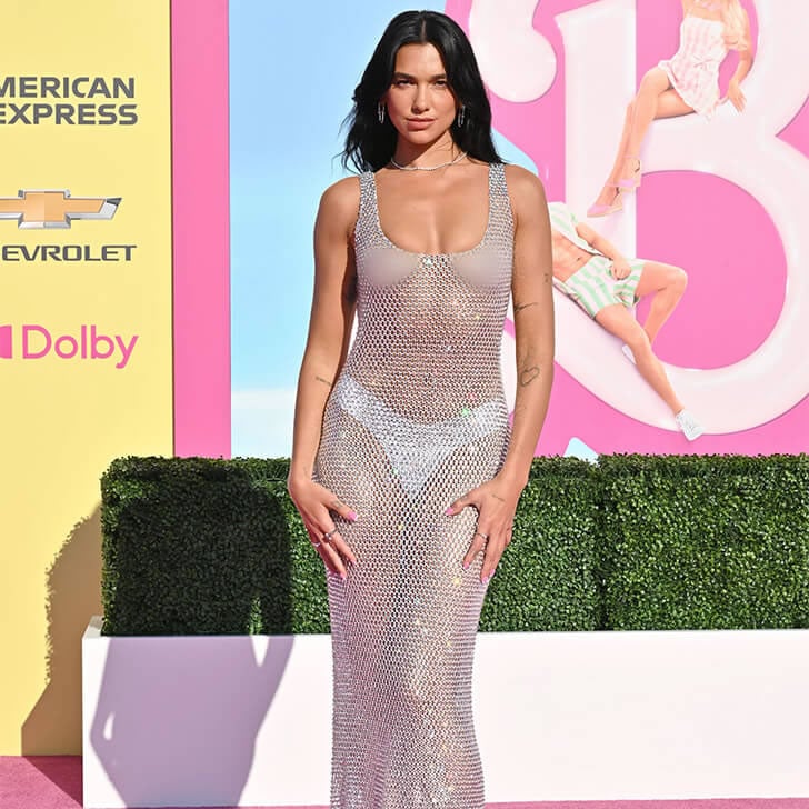 La sensation de la pop, Dua Lipa, sait assurément comment faire tourner les têtes, et sa robe Bottega Veneta à peine visible lors de la première de “Barbie” en 2023 ne faisait pas exception. La robe en résille cristalline scintillait comme de la poussière d’étoiles, laissant peu de place à l’imagination, mais beaucoup de choses à discuter. La chanteuse de “Levitating” a révélé que cette tenue audacieuse était un clin d’œil à son personnage aux cheveux bleus dans le film “Barbie”, et elle a vraiment incarné la Barbie qui sommeille en elle avec style.