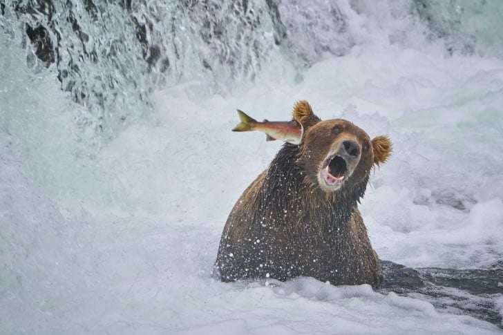 Dans un moment de comédie sauvage parfaitement synchronisé, cet ours semble être pris en plein éternuement ou en plein cri alors qu’un poisson se projette inopinément droit dans sa gueule. La bouche ouverte et l’expression ébahie de l’ours capturent un véritable sentiment d’incrédulité – comme s’il ne pouvait pas croire ce qui venait de se passer. C’est la version naturelle de la comédie burlesque, avec une tournure surprenante et un poisson qui se débat, n’ayant clairement aucune intention de se laisser faire sans combattre.