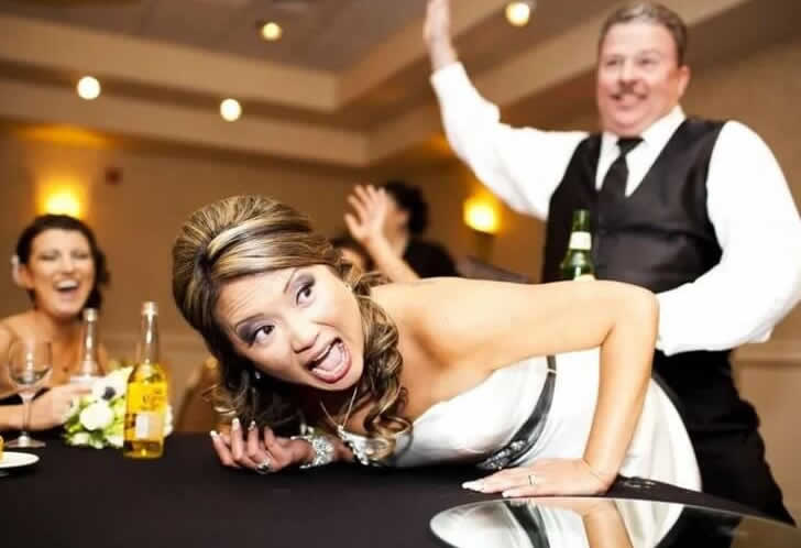 Ihre Gäste sind sichtlich amüsiert, und der Fotograf hat einen Moment festgehalten, der halb lächerlich, halb urkomisch ist. Es mag keine zeitlose Romantik sein, aber es ist sicherlich unvergesslich.