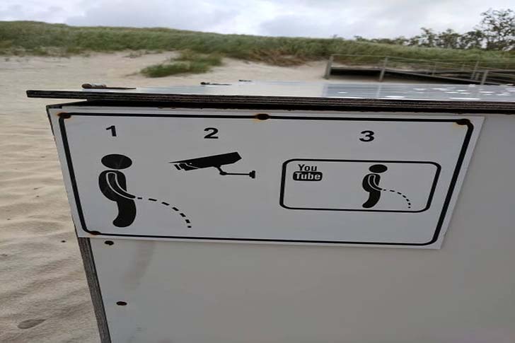 Esta placa em uma bela praia da Lituânia é simplesmente brilhante. A administração da praia parece ter percebido que apenas placas de câmeras de segurança não impedem as pessoas de fazerem xixi em público.