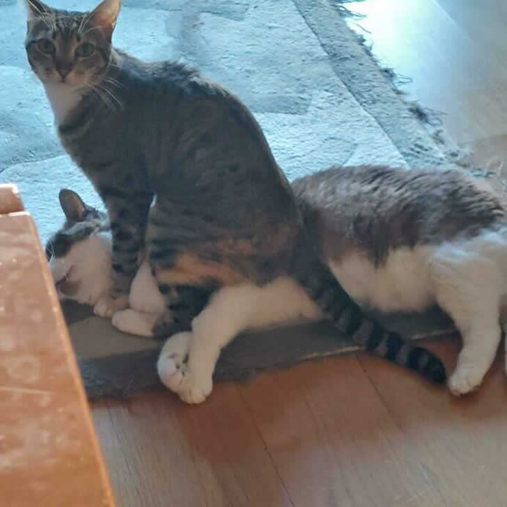 Look at this scene: one cat lying motionless, the other on top, lurking like a furry villain straight out of a film noir movie. Are they cuddling? Is it a display of power? An attempted murder? Nobody knows. The cat on the bottom could be sound asleep… or profoundly deceased. Hard to say.