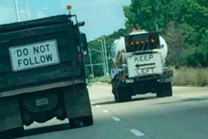 Conduire derrière de gros camions sur l’autoroute peut être risqué, surtout lorsqu’ils transportent des marchandises potentiellement dangereuses. Les camions affichent souvent des panneaux d’avertissement à l’arrière pour alerter les conducteurs qui les suivent. Cependant, un scénario déroutant s’est déroulé pour certains conducteurs lorsque deux camions avec des instructions contradictoires sont apparus devant eux. Un camion à droite invitait les conducteurs à « rester à gauche », tandis que le camion à gauche portait un panneau indiquant « ne pas suivre ».