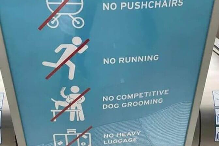 Vous vous souvenez de ces tests scolaires où il fallait identifier l’élément qui ne correspondait pas ? Ce panneau nous ramène à ces souvenirs. C’est un panneau de sécurité d’escalator avec une liste d’interdictions standard, mais il y a une règle particulière ajoutée au mélange. Il est écrit : « Pas de poussettes. Pas de course. Pas de toilettage canin de compétition. Pas de bagages lourds. » Cette troisième règle a-t-elle attiré votre attention ?