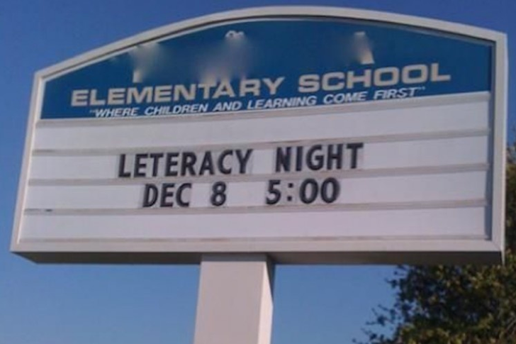 On ne peut qu’espérer que cette pancarte a été délibérément conçue telle qu’elle apparaît. Dans le cas contraire, certains parents pourraient envisager de transférer leurs enfants dans une autre école. La pancarte de l’école affiche : « Leteracy night. » Clairement, il devrait être écrit « Literacy night. » Si c’était une blague intentionnelle, c’est assez ingénieux. Quoi qu’il en soit, cette erreur pourrait bien entraîner une plus grande affluence, car elle ne manquera pas d’attirer l’attention.
