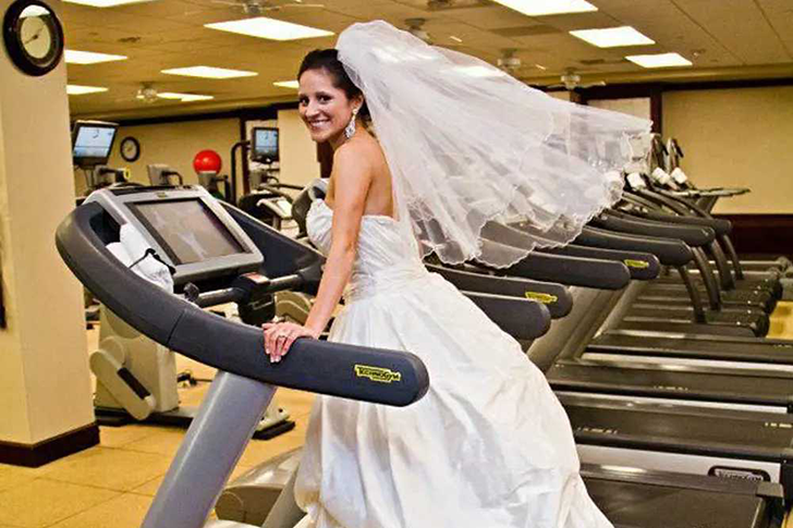 Diese entschlossene Braut hat das “Last-Minute-Workout” auf ein neues Level gehoben. Während die Gäste bereits Platz nehmen, powert sie sich auf dem Laufband aus. Immerhin hat sie es ins Kleid geschafft – jetzt muss nur noch Platz für Champagner und Hochzeitstorte bleiben!