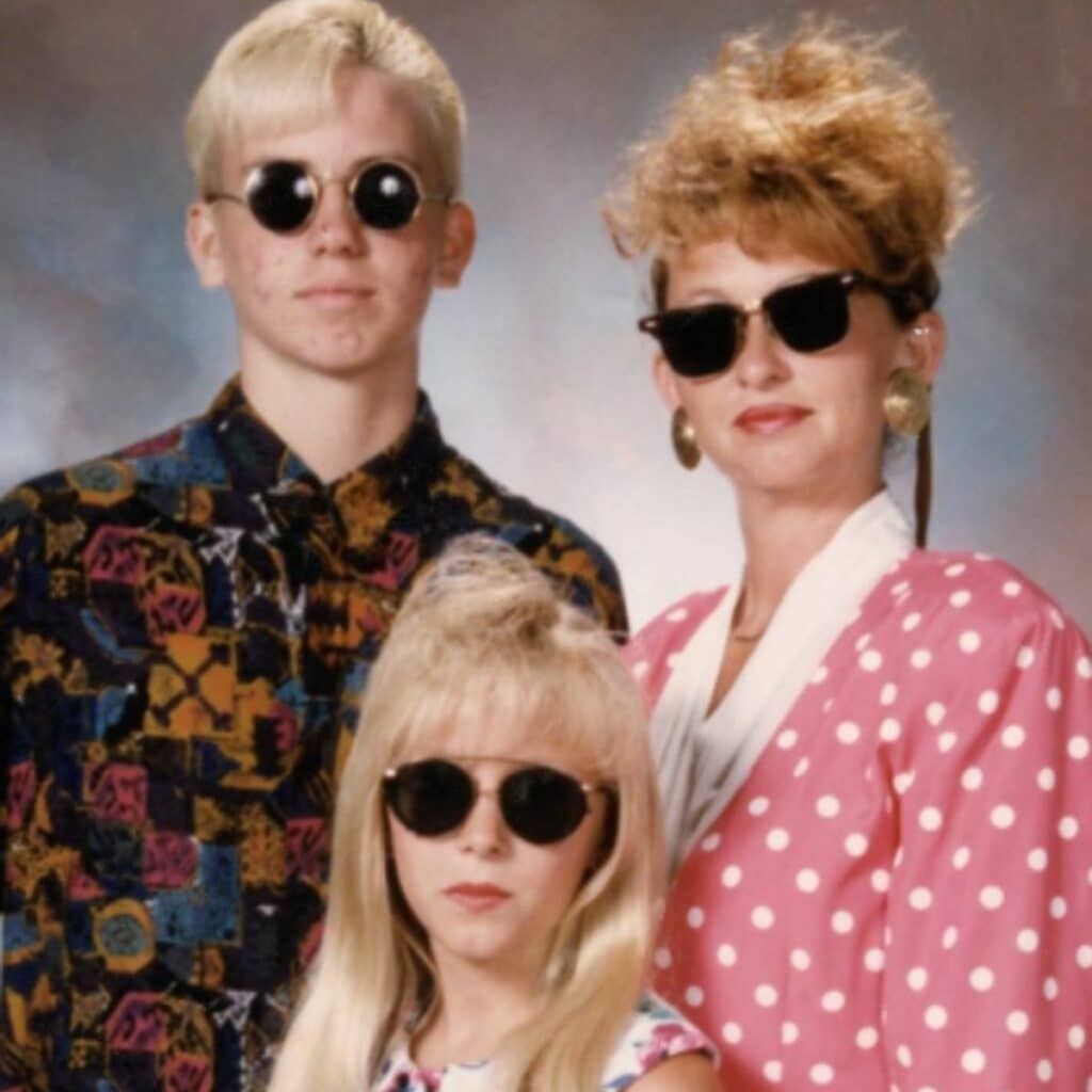 아이고, 이 가족사진은 완전 80년대 추억 소환이네요! 세 남매 모두 클래식한눈이 아플 정도로 화려한 80년대 패턴 셔츠를 입고 있고, 헤어스프레이 한 통을 다 쓴 듯한 헤어스타일을 뽐내고 있어요. 그리고 물론, 모두 정말 멋진 검은 선글라스를 착용하고 있네요 – 이 남매들은 분명 쿨함의 정점이에요.