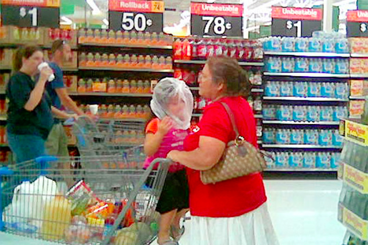 Vimos vários pais e filhos no Walmart ao longo da vida, mas este cenário é realmente extraordinário. Como você pode ver, a mãe desta criança parece não se importar nem um pouco com o fato de seu filho estar com um saco plástico na cabeça. É difícil acreditar que alguém possa ser tão irresponsável.