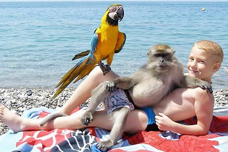 Num cenário de praia tranquilo, uma criança, um macaco e um papagaio estão todos a relaxar juntos. Quase poderia ser o início de uma piada um tanto estranha. Estamos realmente curiosos sobre como conseguiram uma pose tão perfeita para esta foto. Quem o fez deve ser muito bom a lidar com animais e crianças!