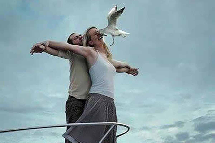 Eles tentaram copiar uma pose icônica, na esperança de tirar uma ótima foto. Infelizmente, foi apenas o pássaro que acabou decolando. Para ser honesto, estamos do lado do pássaro nesta situação. Não há muitas coisas mais divertidas do que animais arruinando planos humanos. Além disso, Titanic já existe há décadas; talvez seja hora de escolher um filme diferente para imitar!